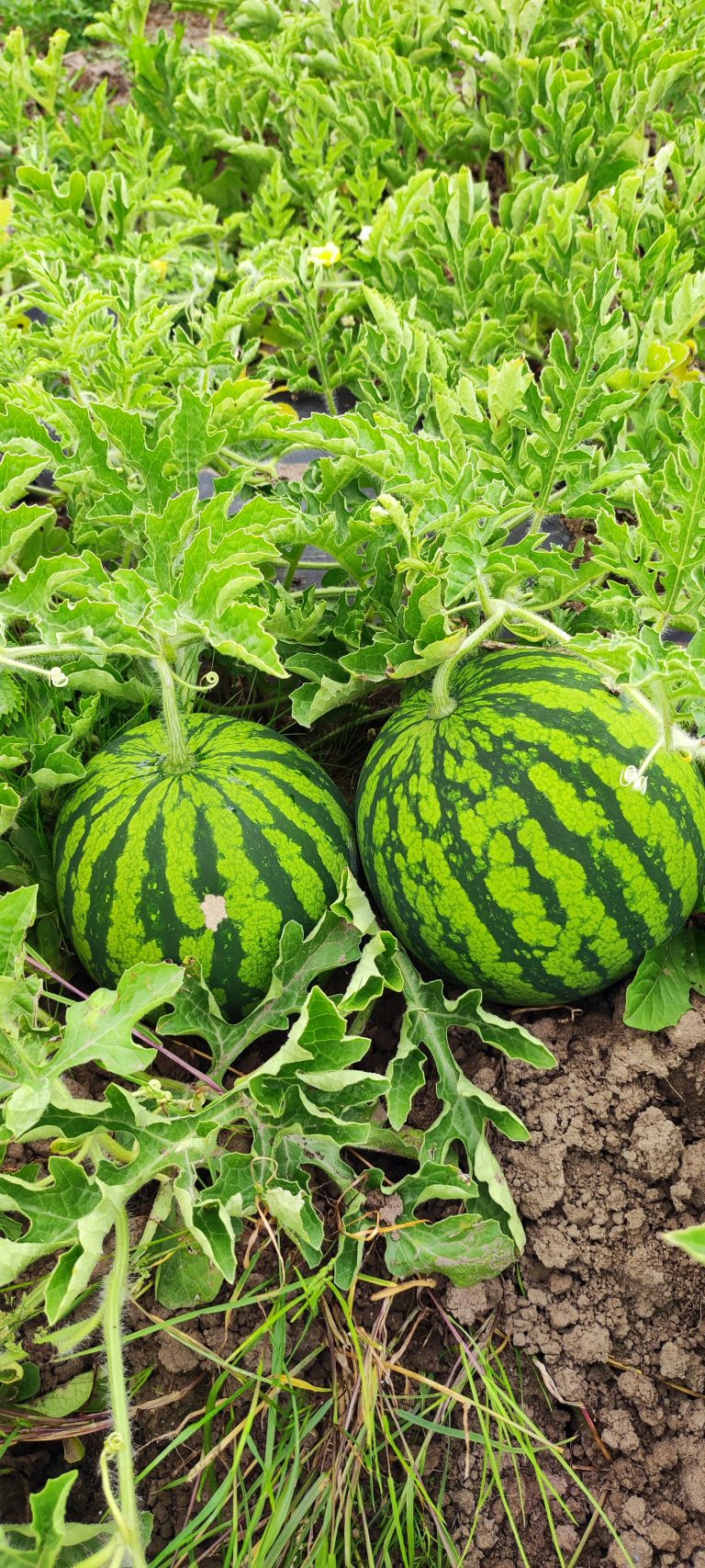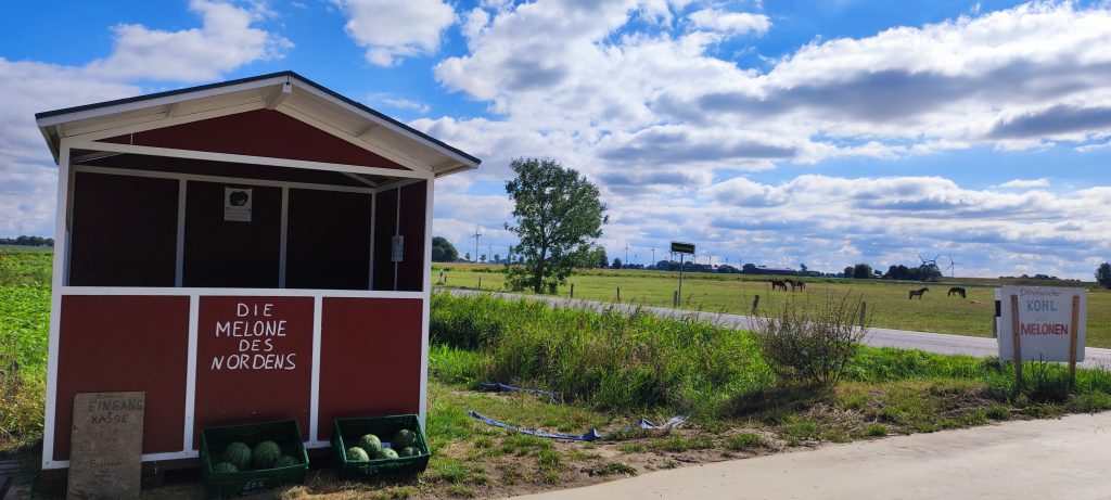 Seit 2020 bauen wir Wassermelonen an. Auf 1 bis 5 Hektar wachsen bei uns seitdem von April bis September/Oktober verschiedene Wassermelonensorten, die ab Ende Juli in der kleinen Bude auf unserem Hof oder bei verschiedenen Verkaufsstellen in der Region gekauft werden können.
