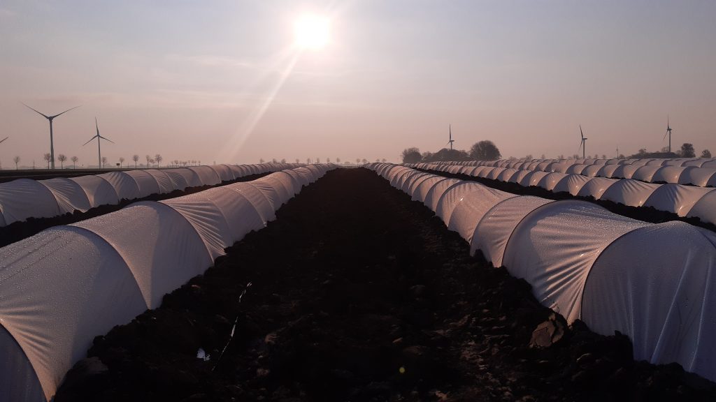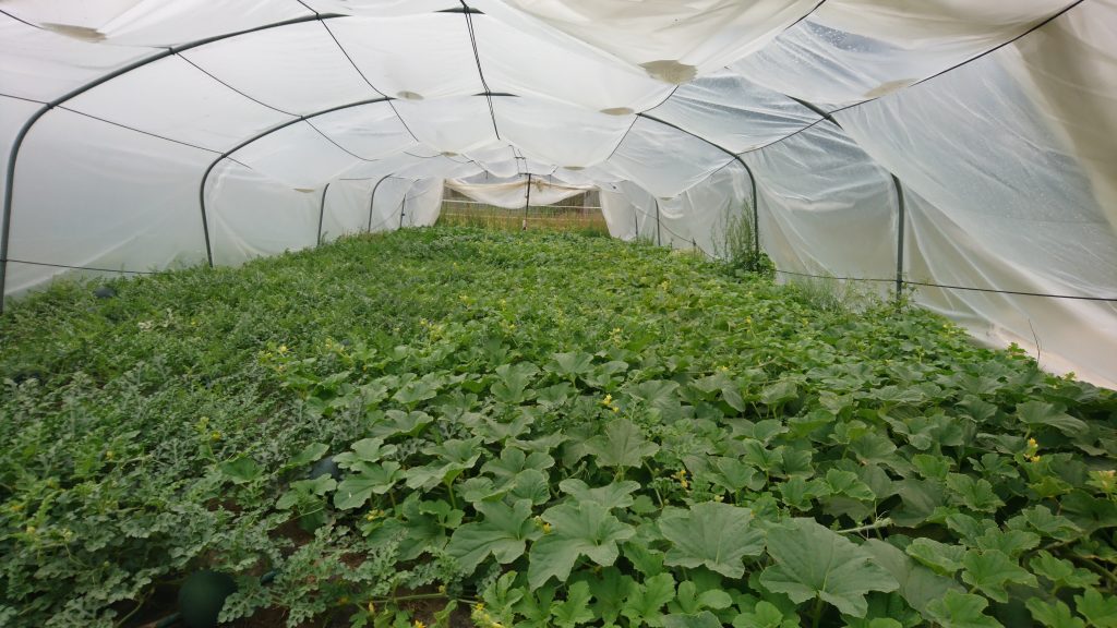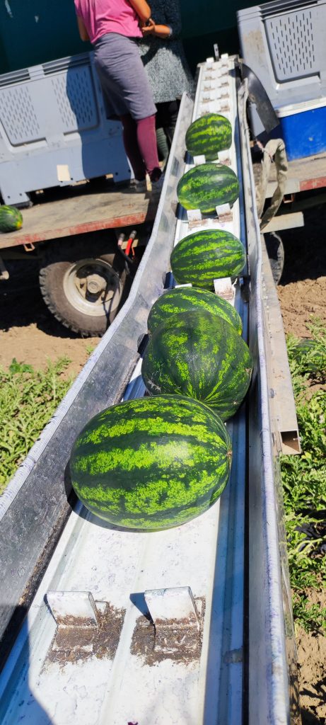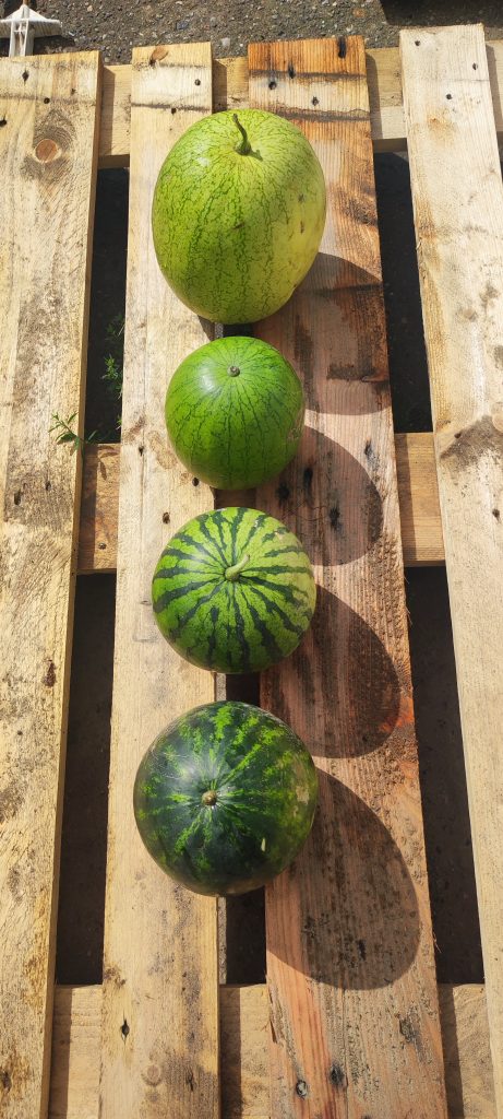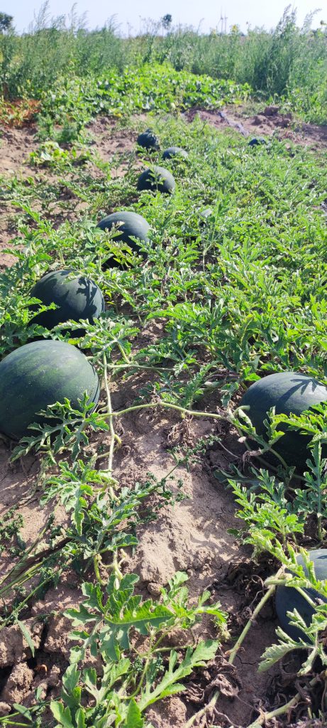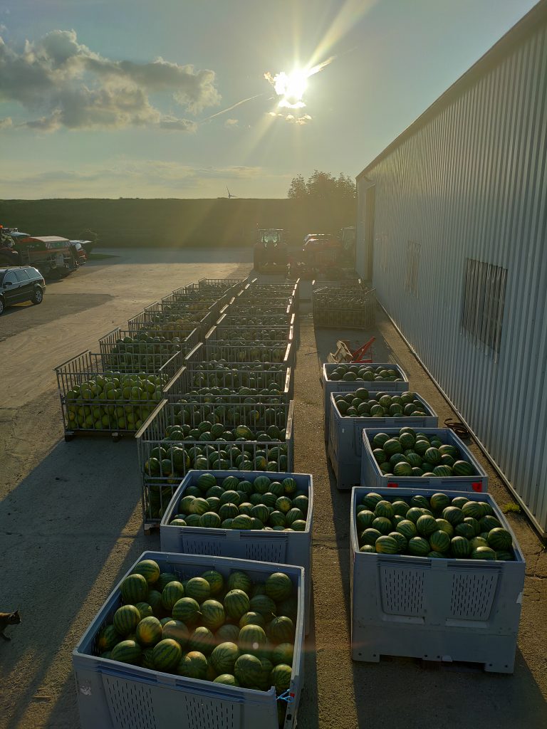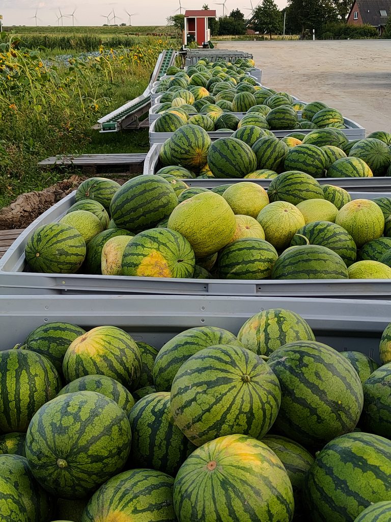 2019 sind wir im Herbst auf die Idee gekommen, Wassermelonen anzubauen. 2020 haben wir diese Idee dann tatsächlich umgesetzt und 2 große Folientunnel auf dem Feld aufgebaut. Dort haben wir ca. 100 Wasser- und Zuckermelonenpflanzen gepflanzt. Und das Ergebnis war so gut, dass wir 2021 direkt 3 Hektar im Freiland angebaut haben, was ebenso hervorragend funktioniert hat, dass bei uns seitdem jedes Jahr auf 2 bis 5 Hektar Fläche Wassermelonen wachsen.