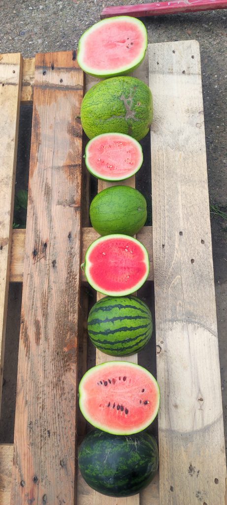 Wir bauen verschiedene Mini-Wassermelonensorten an, die sich in Aussehen, Geschmack und Kernen unterscheiden. Auch wenn man es nicht vermutet, so sind die hellen Sorten mindestens ebenso lecker wie die dunkleren und tatsächlich unser persönlicher Favorit. Unsere Melonen sind Mini-Melonen, die zwischen 1 und 4 kg Gewicht erreichen und somit eine schöne handliche Größe haben.